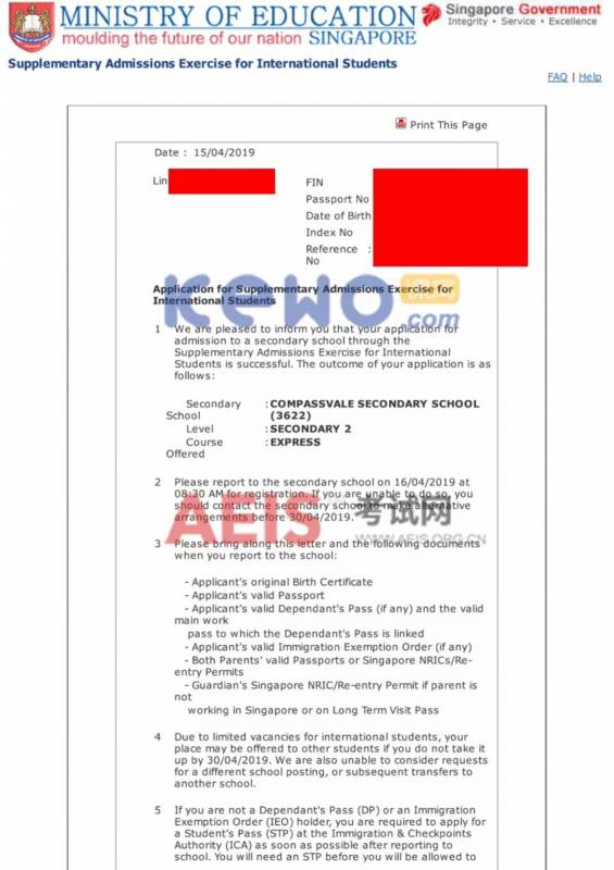 被录取到SENG KANG PRIMARY SCHOOL(P3)