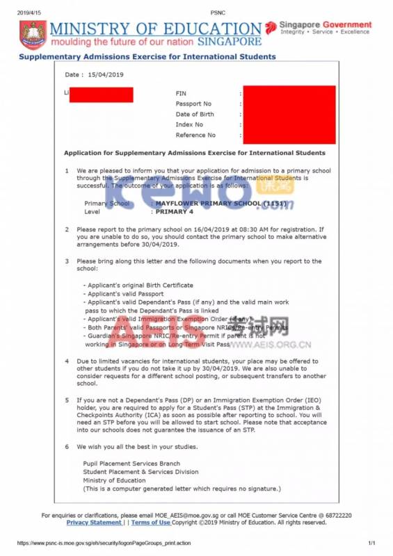 被录取到YISHUN PRIMARY SCHOOL(P4)
