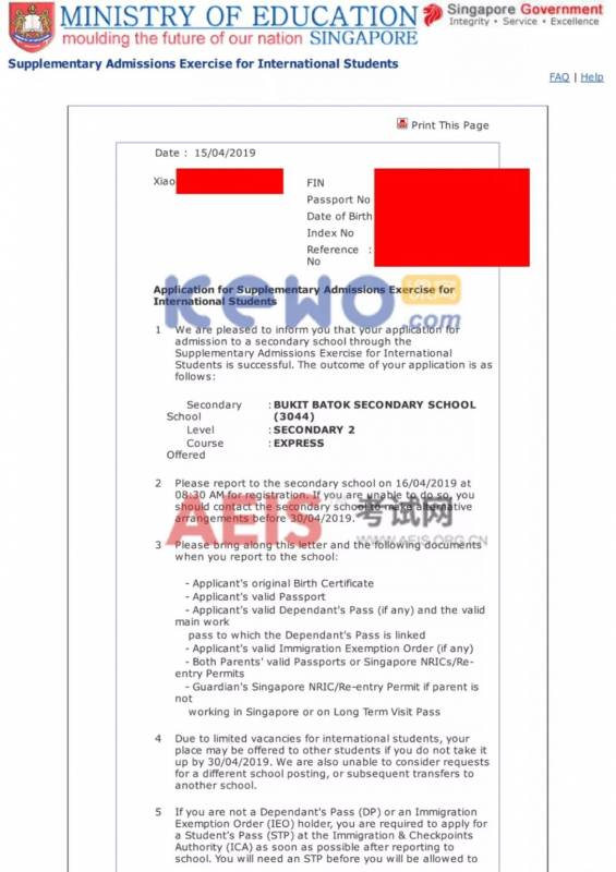 被录取到BUKIT BATOK SECONDARY SCHOOL(S2)