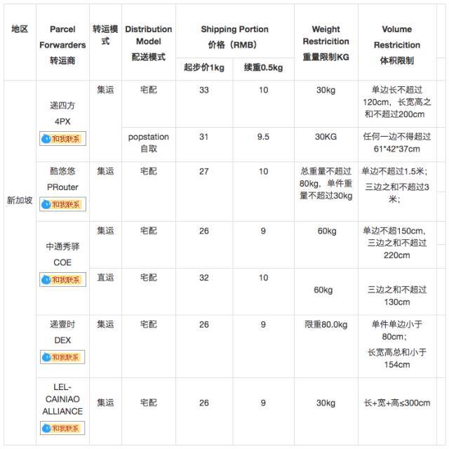 新加坡地区支持的淘宝官方物流合作商有五家,大家可以查看下表,以便了解各物流转运商在新加坡地区的运费价格以及包裹的材积限制:
