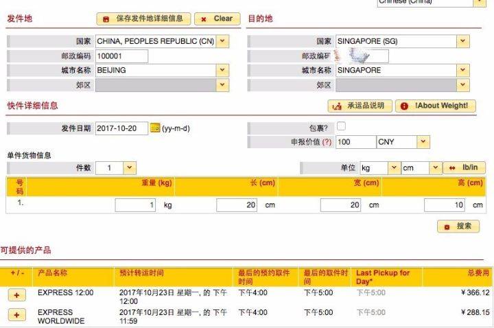 按照要求在网站上http://dct.dhl.com/#shipping_options输入信息,点击“搜索”就能一键获得DHL提供的服务与价格了。貌似比顺丰贵上不少哦。