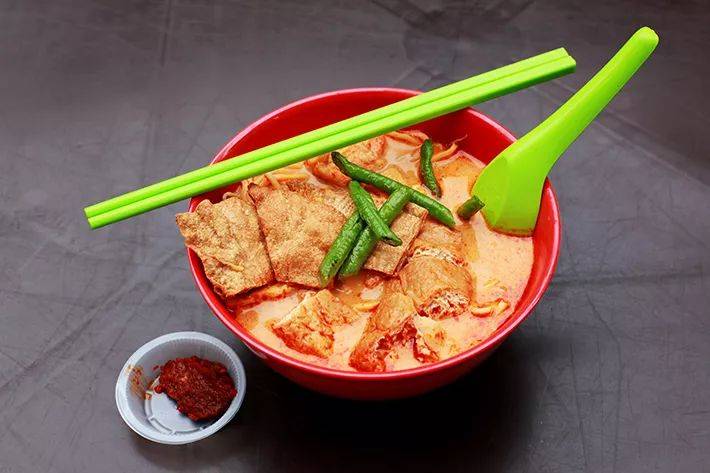 这里这碗叻沙的汤底一点都不粘稠,汤底比较清入口有淡淡椰奶味,不会太腻。你可以选面或米粉,再搭配上鱼丸、豆皮和长豆等配料。