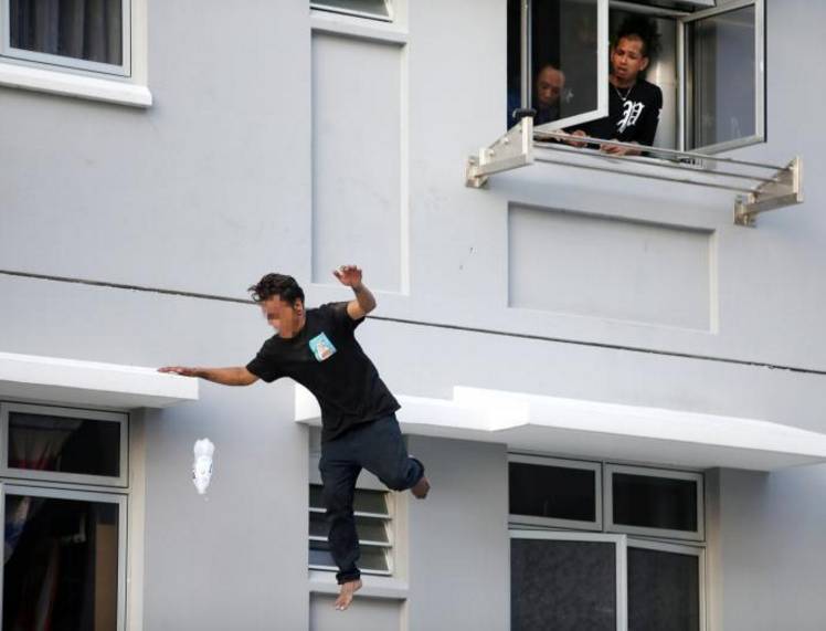 此外,男子也不断从单位外的墙沿跳到隔壁墙沿,