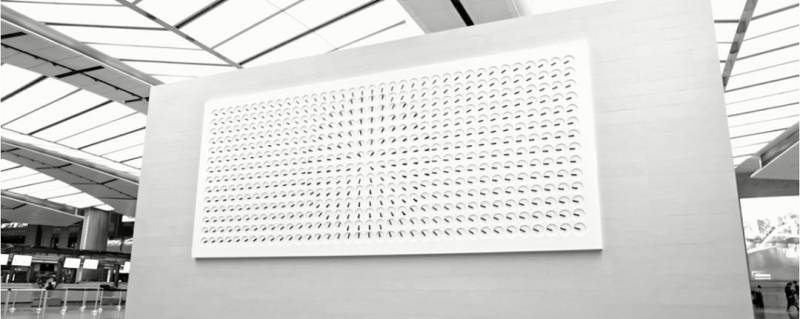 宽达7.5米和1008个独立马达构成的时之语,是目前世界上最为大型的动态艺术装置之一。白色的钟面,黑色的指针,如同随着圆舞曲流畅的旋律,从无法预知的节奏而一齐旋转至完美同步,每一寸跳着的“舞步”都将抽象化的时间概念,优雅并清晰得播报给旅人们。
