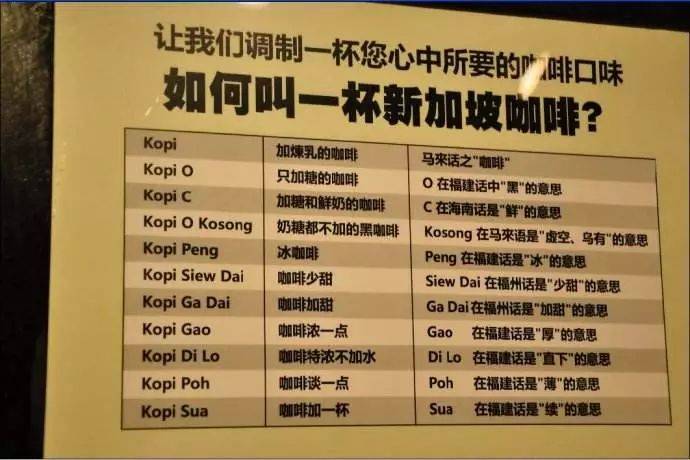 现代新加坡中文的对话情景,天天都在咖啡店、小贩中心摊位档口中出现。这种中英文夹杂、福建话和马来文相混的中文语汇,虽着实让初来乍到的旅客摸不着头脑,另一方面也凸显当地中文语汇表达的多元特色。