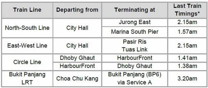地铁南北线、东西线、环线和武吉班让轻轨列车最后一班车的时间将延长到第二天凌晨。