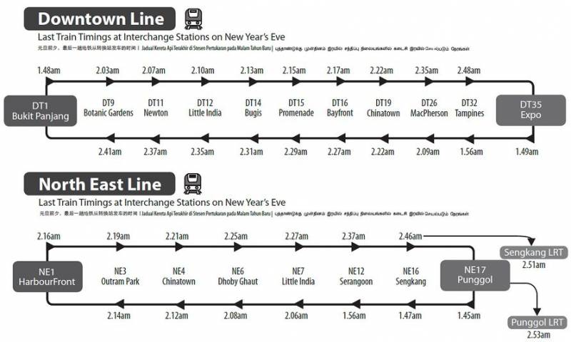从海湾舫站(Bayfront)至武吉班让站(Bukit Panjang)的最后一趟地铁列车,出发时间则延长至1月1日凌晨2点27分。