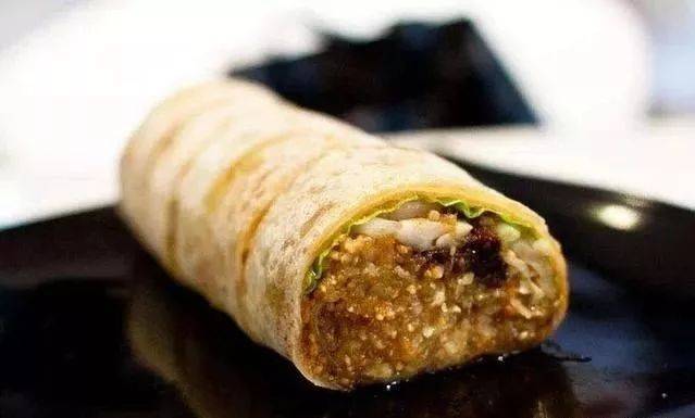 一张纤薄的面皮,涂上各种甜辣酱,铺上萝卜、豆芽、生菜、黄瓜丝、花生末、脆面包末,以及独家配置的米面,卷起来切成一段段的,吃上一口,融合各种口味,酸甜咸辣,各种滋味涌上心头。