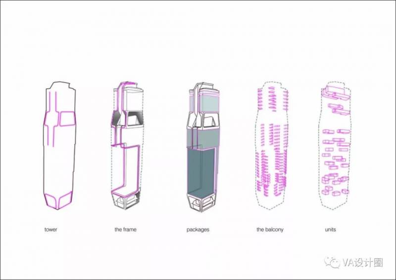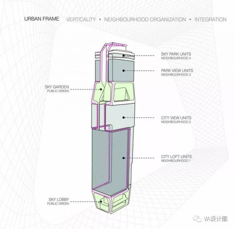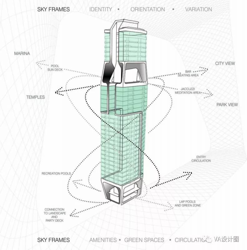 垂直城市的概念与绿化区域通过两种形式紧扣在一起:“垂直框架”和“天空框架”。垂直框架以城市方式组织塔楼。