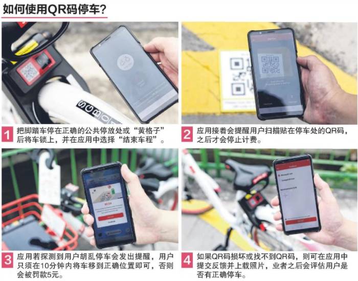 新加坡已在全岛22万个公共脚踏车停放位张贴特制QR码。用户把脚踏车停好后,须扫描QR码,乱停车的用户会收到应用发出的提醒,如果在10分钟内没有把车移到正确的停放区就会被罚款。