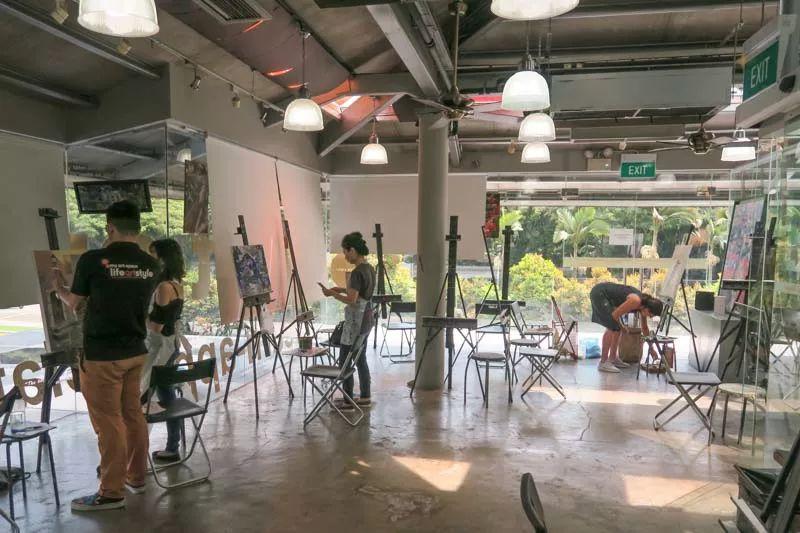 新加坡有许许多多的小画室,其中大部分还是和咖啡厅或餐厅结合的复合式画室咖啡厅。这些画室并不是为艺术生而开设的,是给大众开放的,没有绘画基础的朋友也可以去哦。画具,颜料,画布等等都会提供的,为了防止颜料沾染到衣服上,也会有围裙提供呦。