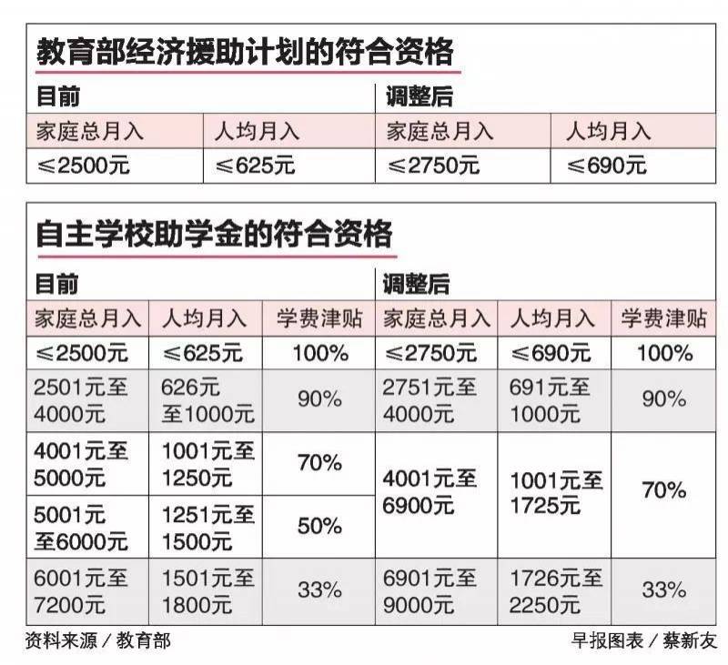 广告目前,家庭总月入不超过9000新元,或人均月入不超过2250新元的学生,能获得介于33%至100%的学费津贴与其他援助,视经济情况而定。