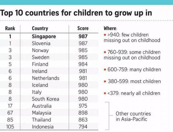 国际非政府组织“救助儿童会”(Save The Children)上周三发布的《童年终结数据》报告中,新加坡被评为最适合孩童成长的国家。该组织根据健康不佳、营养不良、失学、童工、童婚、过早怀孕和极端暴力等可能破坏童年的指标,计算出175个国家的“终结童年指数”,新加坡与斯洛文尼亚同获987分,并列第一。