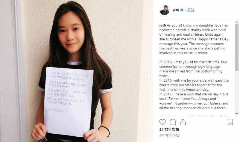 在去年的6月,李连杰就曾在INS上发布,称:Jada送了自己一份很棒的父亲节礼物。