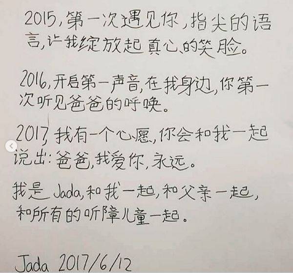2015年,我第一次见到你,指尖的语言让我绽放起真心的笑脸;2016年,开启第一声音,在我身边,你第一次听见爸爸的呼唤;在2017年,我有一个愿望,你会和我一起大声说出:爸爸我爱你,永远。
