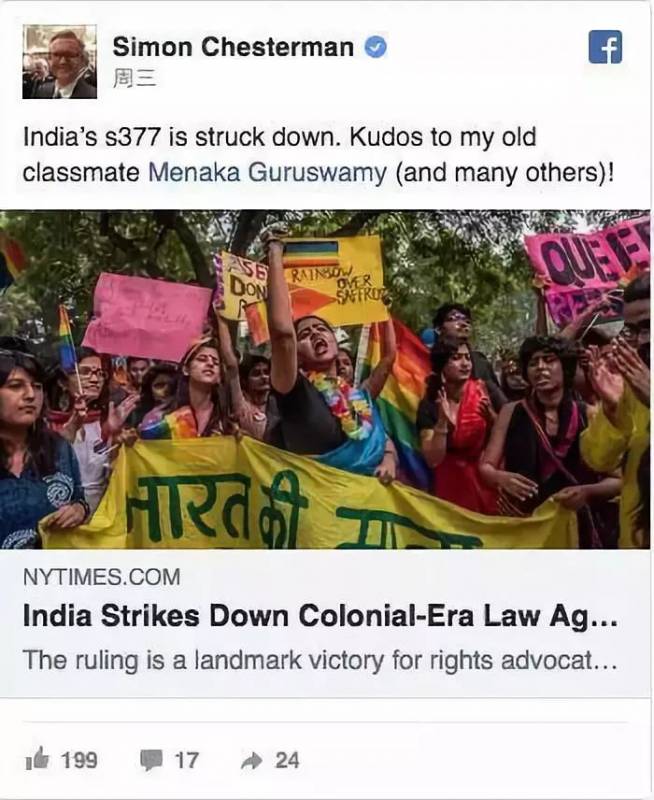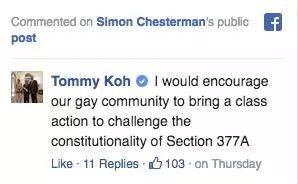 新加坡国立大学法学院院长陈西文教授,随即在Facebook上转载了印度将同性恋性行为合法化的新闻,祝贺昔日同窗印度籍同学取得成功。巡回大使许通美教授随后也留言表示,呼吁新加坡本地同性恋社群挑战现有法律的宪法性。