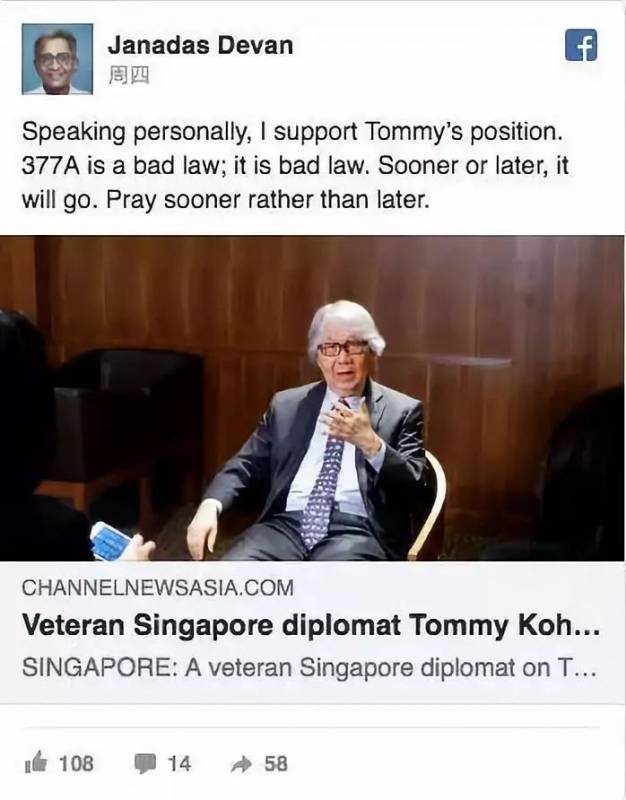 政策研究院院长贾纳达斯在他的个人Facebook页面中写道:“就个人而言,我支持通美的立场。第377A节条文是一条糟糕的条文,是糟糕的法律。”并说,“它迟早是会被去除的,不过但愿是更早,而不是更迟。”