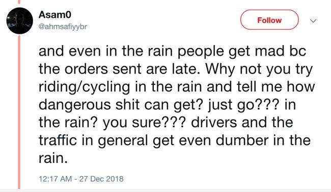 他也分享了他和其它外卖送餐员在这个似乎不讨人欢迎的行业所面临的困境,比如,在下雨天,顾客会因为他们送餐晚了而向他们生气: