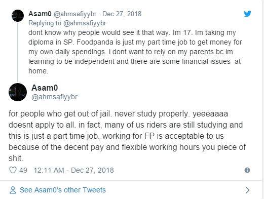 而据该推特用户讲述,他自己其实是一名在新加坡理工学院念书的学生。自己因为想要独立自主,不想要一直依赖父母,加之家庭经济状况出了一些问题,所以就找了Foodpanda送餐员的兼职工作。