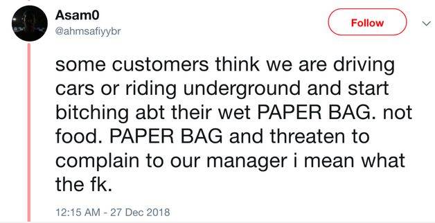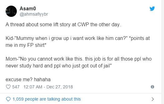 事情是这样的,本月的27日,一名推特用户“@ahsmsafiyybr” 爆料称,他是一个Foodpanda的送餐员,最近在送餐过程中,遭遇了职业歧视的事情---他当场被一位母亲当作“反面活教材”来教育自己的孩子。