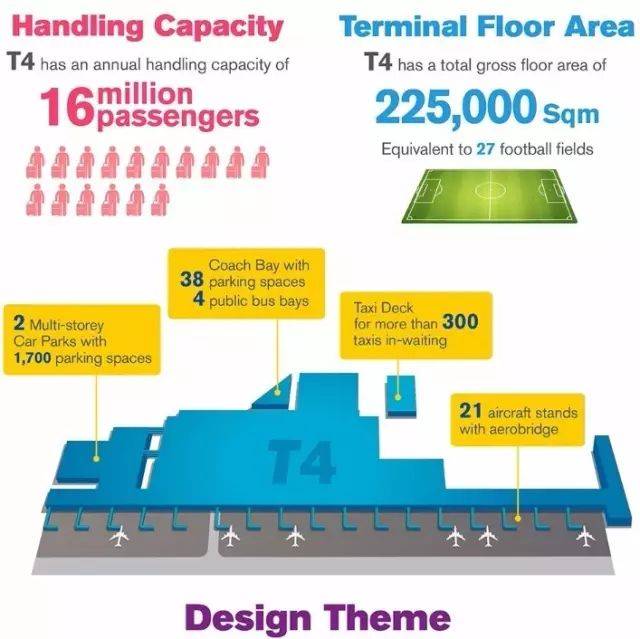 T4航站楼耗资9亿8500万新币,总占地面积为225,000平方米,相当于27个足球场;正式启用后的年客流量约为1,600万人次;2个多层停车场,共1,700个停车位;小巴停车场共有38个车位,公车停靠站共4个;的士站可供300辆的士停泊;飞机停机位共有21个。