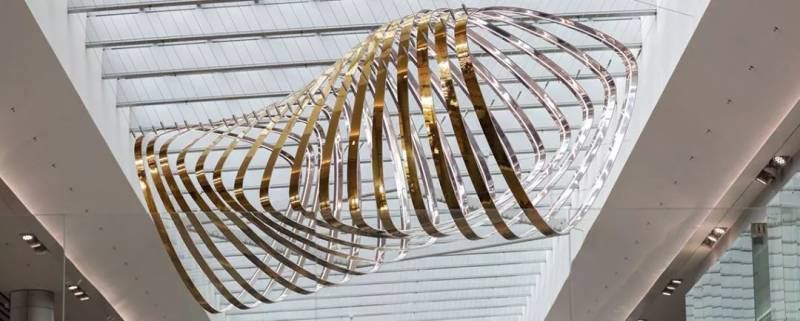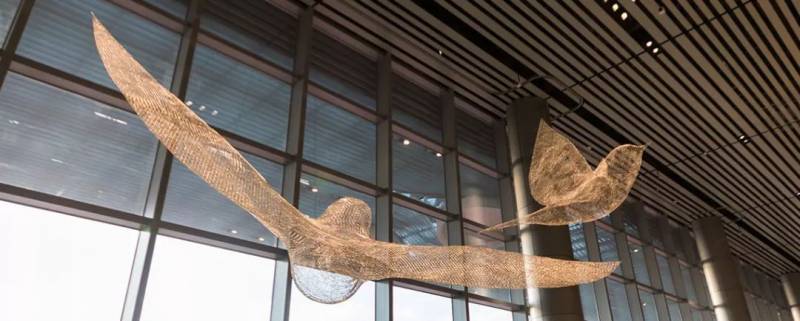 羽之灵”是三只手工打造的不锈钢铁丝鸟结构雕塑,十分精巧,由法国艺术家 Cedric Le Borgne 创作。一只鸟在地面上栖息,另外两只则悬于空中,展翅翱翔。这三只鸟象征着天地之间、梦与现实之间的连接,反映了人们日常生活中富有诗意的一面。