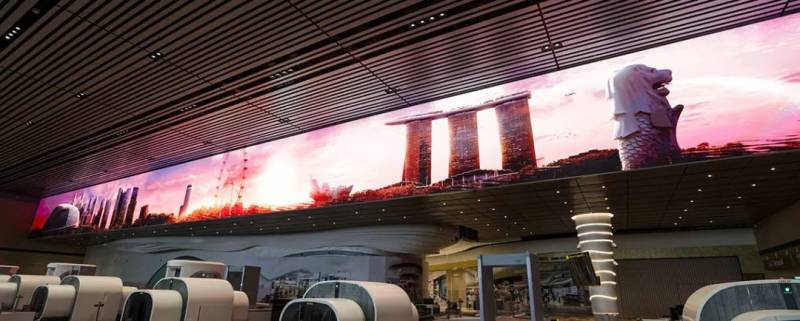 70 米宽 5 米高的 LED 显示屏展示出新加坡的天际线美景以及连接樟宜机场的各个东盟各目的地。