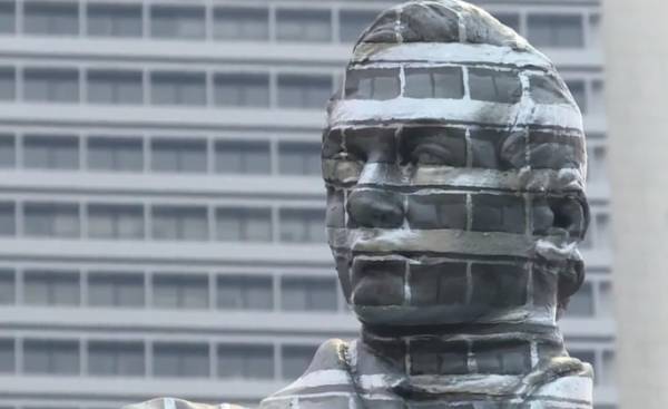 莱佛士雕像被画上与后方建筑相似的图案。(《8频道新闻》截屏)