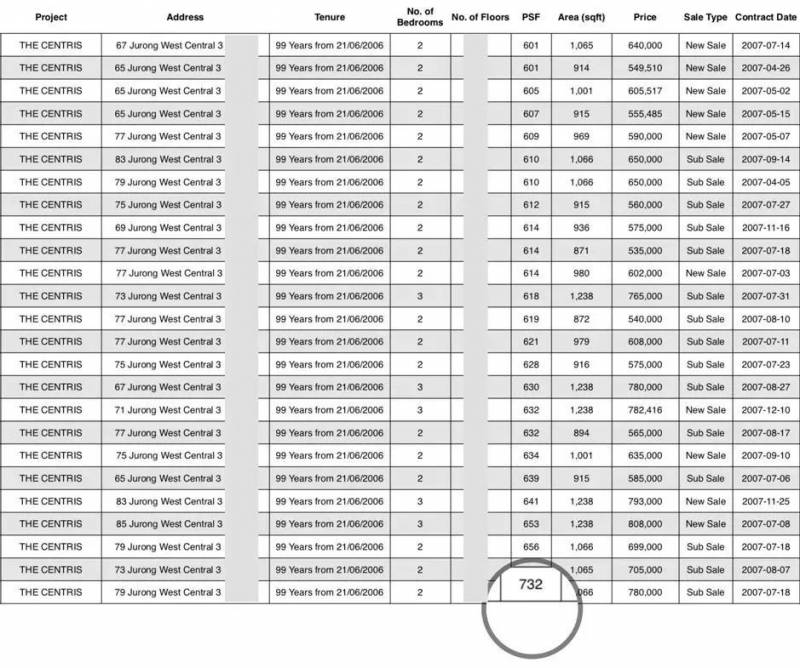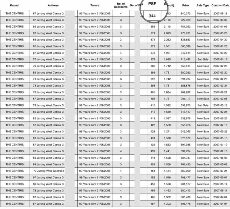 裕廊西The Centris,在2007年里交易价,仅$344至$732/平方尺。