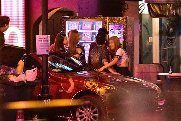 “神秘酒吧”外放著名车、贩卖机,性感女郎上前迎客。(海峡时报)