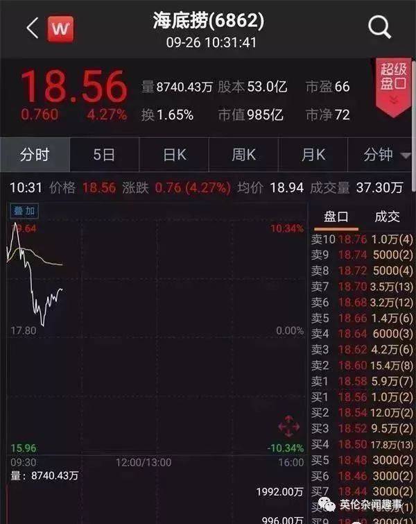 随着海底捞董事长、创始人之一张勇、营运长杨利娟大力敲响港交所的铜锣,海底捞国际控股有限公司 (海底捞)在联交所主板挂牌交易,开盘涨5.62%。