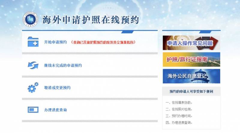 2016年,“海外中国公民护照在线预约系统”(网址:https://ppt.mfa.gov.cn)正式启用。海外中国公民可以通过该系统,在线预约护照、旅行证申请,并在系统中自行选择受理馆别、填写表格、提交照片并预约办理时间。