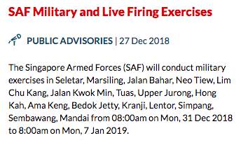 这次的军事演习将从12月31日上午8点持续到1月7日上午8点,地点在实里达(Seletar)、马西岭(Marsiling)、惹兰巴哈(Jalan Bahar)、梁宙(Neo Tiew)、林厝港(Lim Chu Kang)、惹兰国民(Jalan Kwok Min)、大士(Tuas)、裕廊上段(Jurong)、丰加(Hong Kah)、亚妈宫(Ama Keng)、勿洛码头(Bedok Jetty)、克兰芝(Kranji)、伦多(Lentor)、新邦(Simpang)、三巴旺(Sembawang)和万礼(Mandai)。演习过程中将使用空弹和雷光弹。请公众不要惊慌,也尽量远离演习区域。