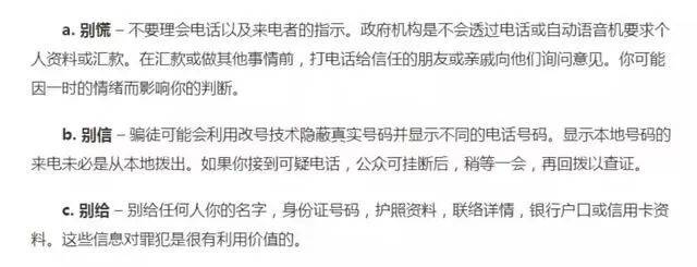 这个事件中,骗子的手法其实并不高级,圈套也就很容易被识破,有鉴于此,新加坡警方已在社交媒体发布了避免被诈骗的三“不”提醒