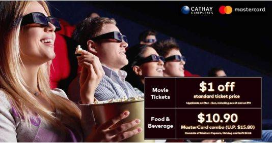 使用万事达卡(Mastercard)购买电影票,即可享有$1优惠。还能以$10.90享有爆米花+饮料+香肠美食配套(原价$15.80)。