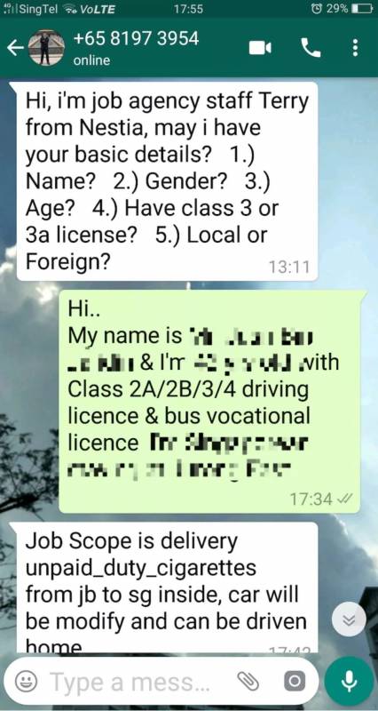 广告待用户回复后,骗子便会详细解释工作内容:将漏税香烟从柔佛新山带进新加坡,会对车进行改装,车可以开回家。