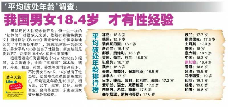 相反,亚洲的平均初夜年龄在各大洲的比拼中毫无意外地垫了底,新加坡的朋友们则整体偏向晚熟,平均18.4岁才献出了“第一次”。