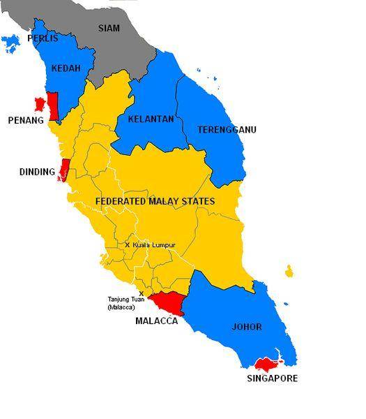 大家可以在地图上看一下这三个地点,分别在马六甲海峡的两端和中间(图片来自维基百科,红色为海峡殖民地的范围)。从槟城(PENANG)到新加坡(SINGAPORE),大致就是马六甲海峡的主要部分。槟城和马六甲(MALACCA)现在为马来西亚联邦的两个州。槟城旁边的天定(DINDING,现在叫Manjung),在1874年后加入海峡殖民地。