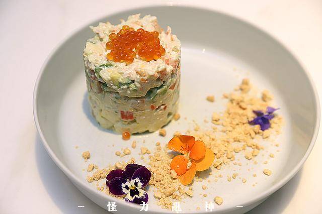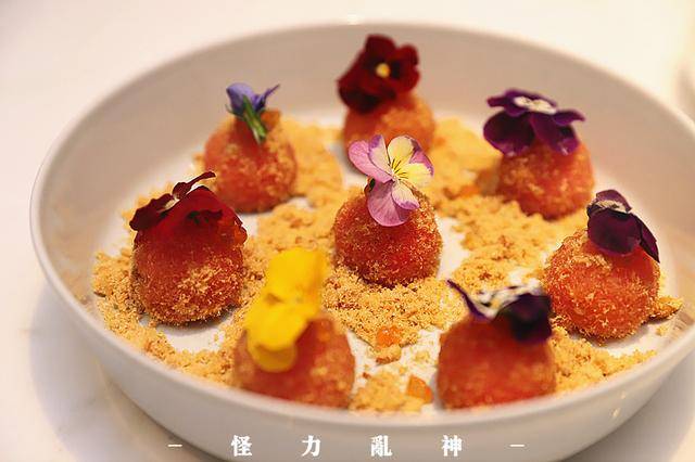 一开始还以为是山楂球,没想到是西瓜球搭配三文鱼籽和吞拿鱼松,很有创意的餐前菜。