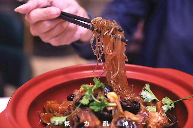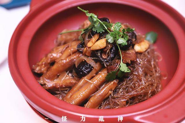 狮城鹅掌粉丝煲,刚刚上桌的时候伴随着腾腾热气。上面盖着的鹅掌等食材咸香爽脆,底下铺着粉丝,煲的越久粉丝越入味。