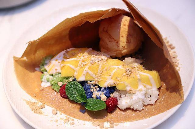将很有特色的芒果糯米饭与冰淇淋可丽饼结合在一起,不仅好看还很好吃!甜甜的芒果糯米饭香甜软糯,冰淇淋和芒果果肉搭配着一起吃,简直幸福到起飞!