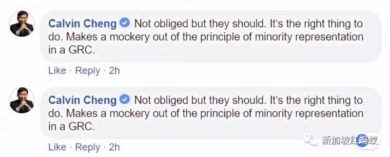 不过前官委议员郑恩里(Calvin Cheng)在《亚洲新闻台》这则新闻的面簿留言说:“虽然政府没有义务这么做,但是他们应该这么做。这是对的事。反之,则是在嘲笑集选区内的少数民族代表的原则。”或许是重要的话都必须说两遍吧,同样的留言他贴了两次。