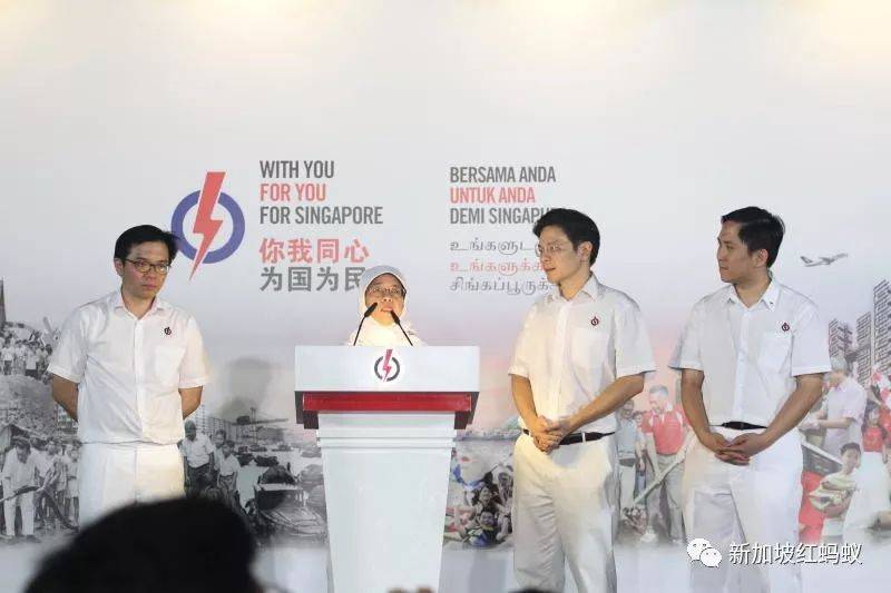 2015年大选,人民行动党马西岭—油池集选区团队以6万8485张选票, 68.73%得票率获选。原国会议长哈莉玛(左二)和马西岭——油池集选区竞选团队的其他成员王鼎昆(左一)、黄循财(右二)和任梓铭一起上台致词。(联合早报)