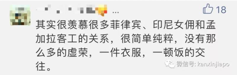 还有网友透露,菲律宾印尼女佣和客工们的关系很纯粹,没有那么多虚荣,一件衣服、一顿饭就能交个朋友。