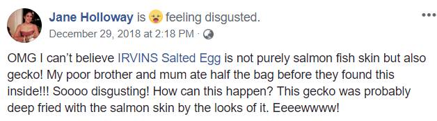 上周六(12月29日),一名网友在Facebook中爆料,她去年11月在泰国曼谷一家超市购买的Irvins咸蛋黄鱼皮竟然吃出壁虎!