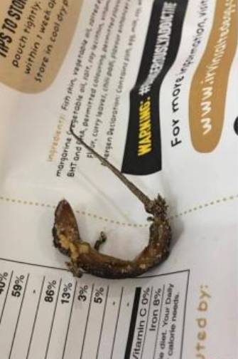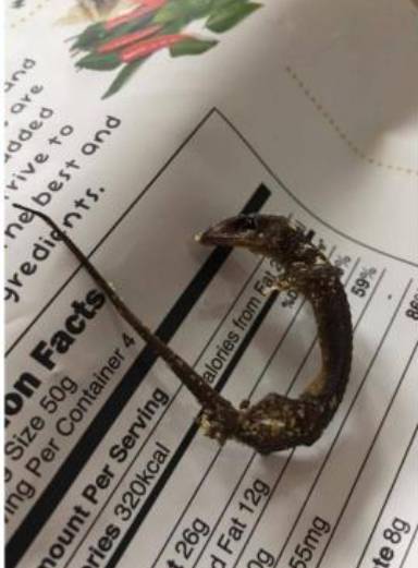 “我的兄弟和妈妈吃了半包之后才发现里面有一只炸壁虎,恶心死了!”