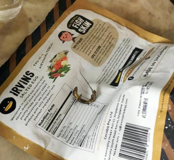 广告指购买的IRVINS咸蛋炸鱼皮零食内发现了“炸壁虎”...