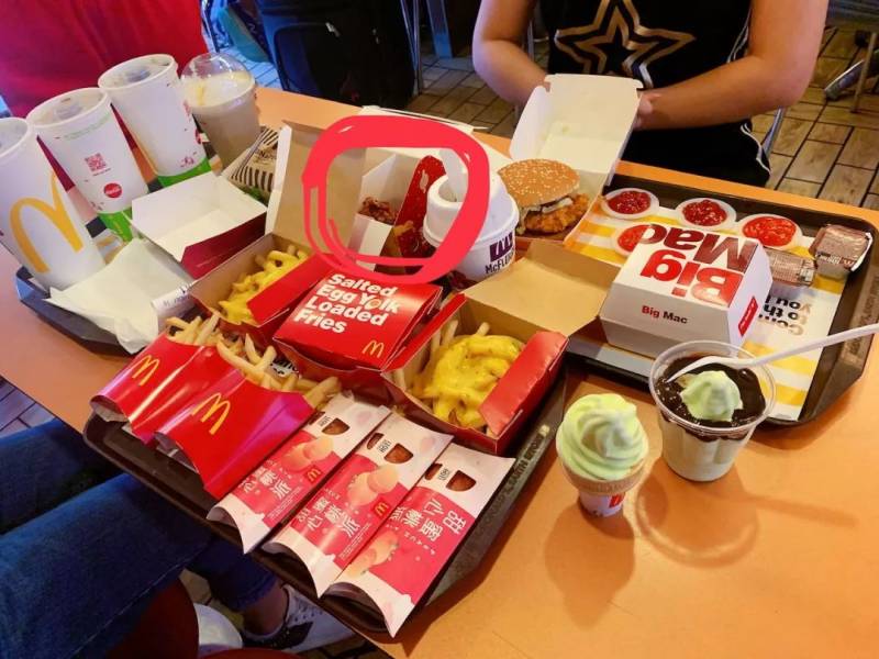 麦当劳黄黄的灯光不太能拍出食物的诱人之处,但是除了冰淇淋的卷儿不如广告里的完美之外,色泽、分量方面都还是很符合的。