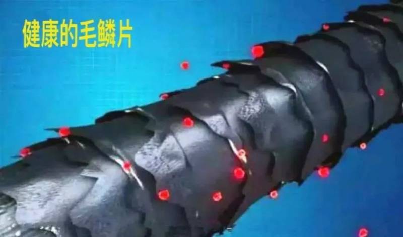 但是经过紫外线的照射,空气的污染,表面的毛鳞片就会大量的脱落,如下图!