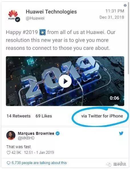 迎来新的一年,各大科技公司纷纷在社交媒体发文庆祝,不过,华为的新年祝福推文却被网友找出了一个小“破绽”。华为官方Twitter以华为全体员工的名义向网友送上新年祝福。不过,这篇推文下方却留下了“自Twitter的iPhone客户端发出”(Via Twitter for iPhone)的标记。华为发出这条推文后,随即将其删除,然后重新发送。